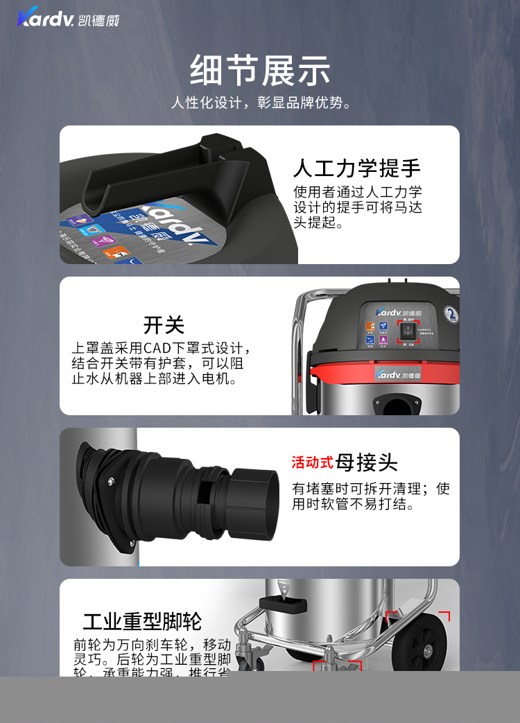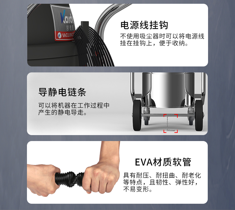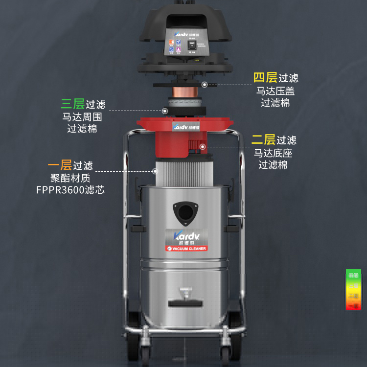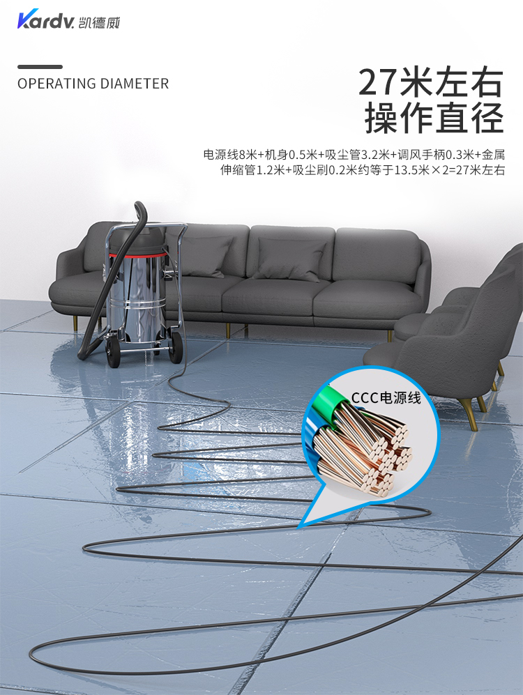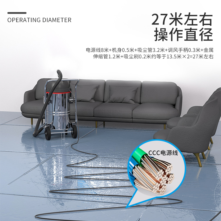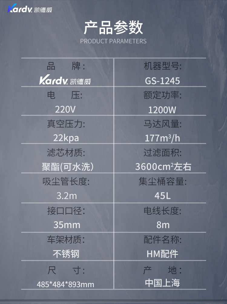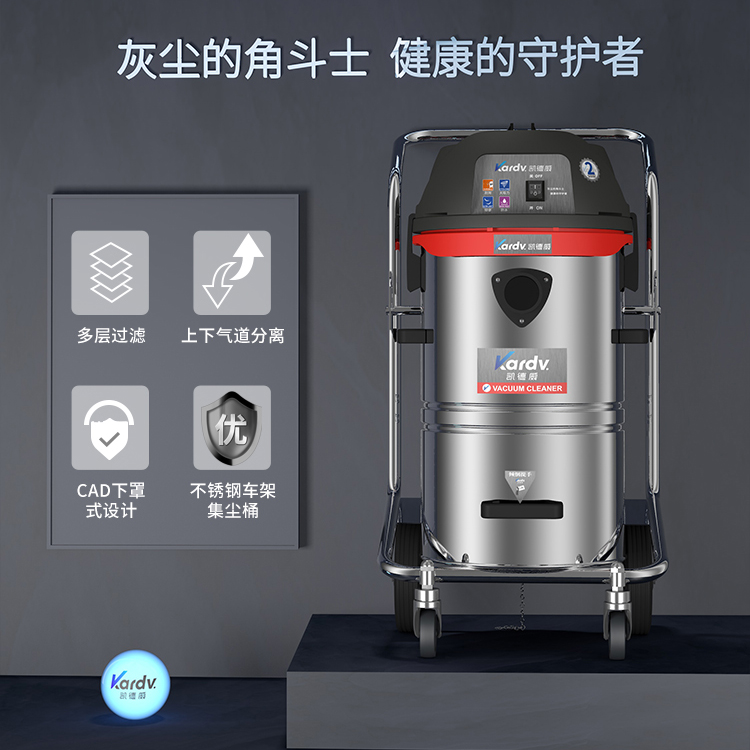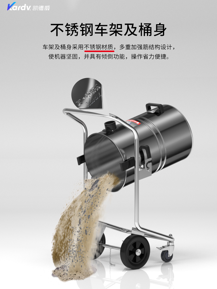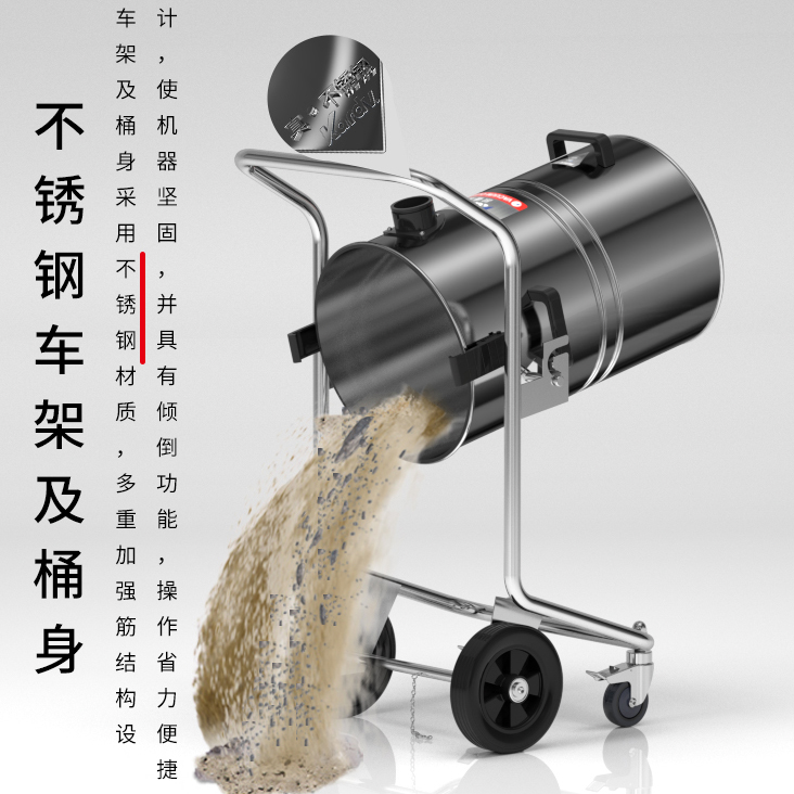 GS-1245是一款工商業型吸塵器,有可達45L左右的不銹鋼材質制成的集塵桶,同時它配有前輪為萬向輪并帶剎車的不銹鋼車架使用起來靈活輕便。可以用在工業環境中,也可以使用在普通的商業、企業環境。