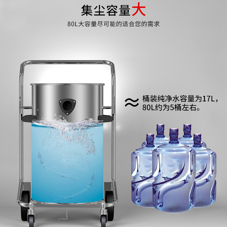GS-3078B是一款工業型吸塵器,集塵桶為80L,為不銹鋼材質,配有不銹鋼車架,在移動時輕巧方便;可以用在工廠、倉庫或建筑工地等場所清理灰塵等,在商業環境中也可以使用。