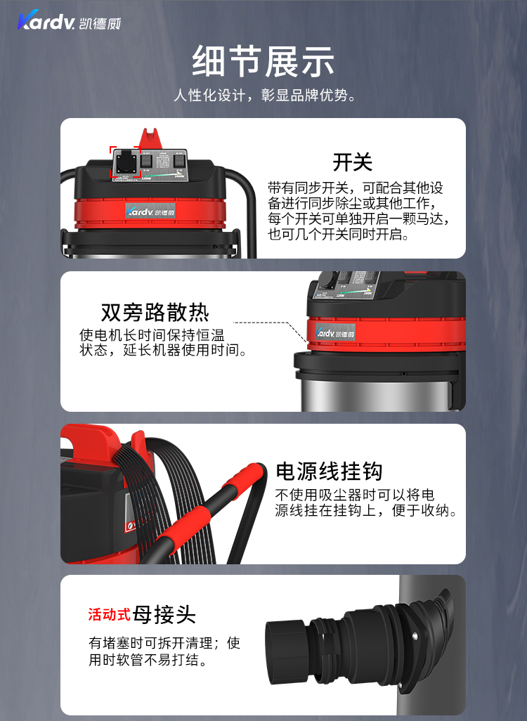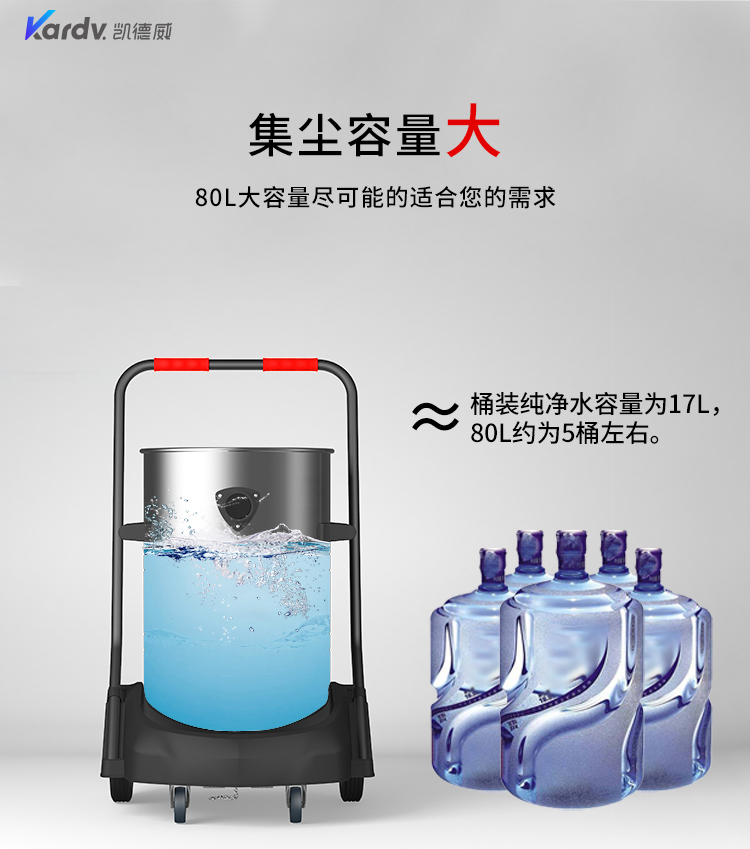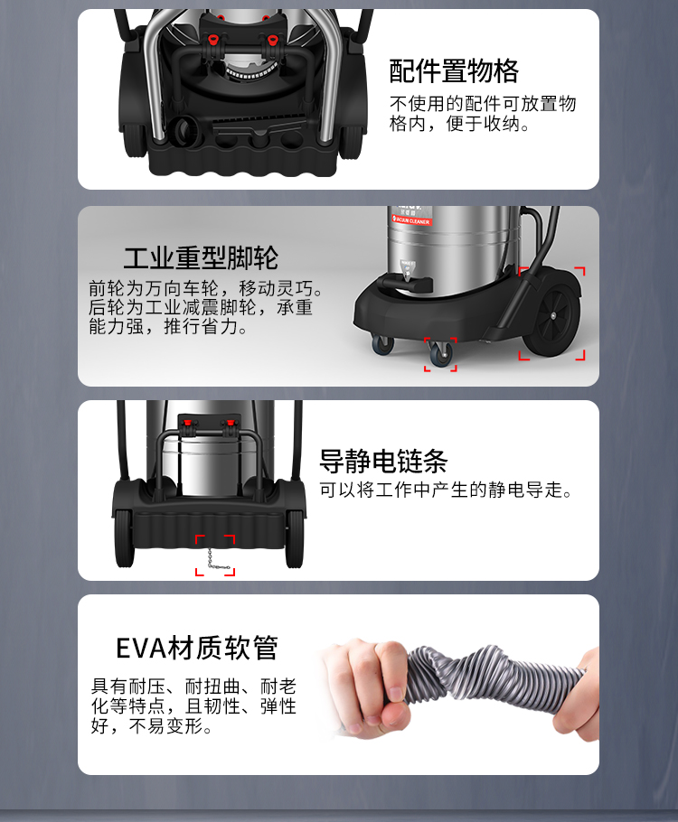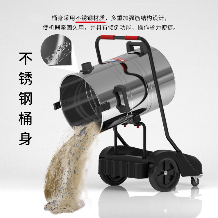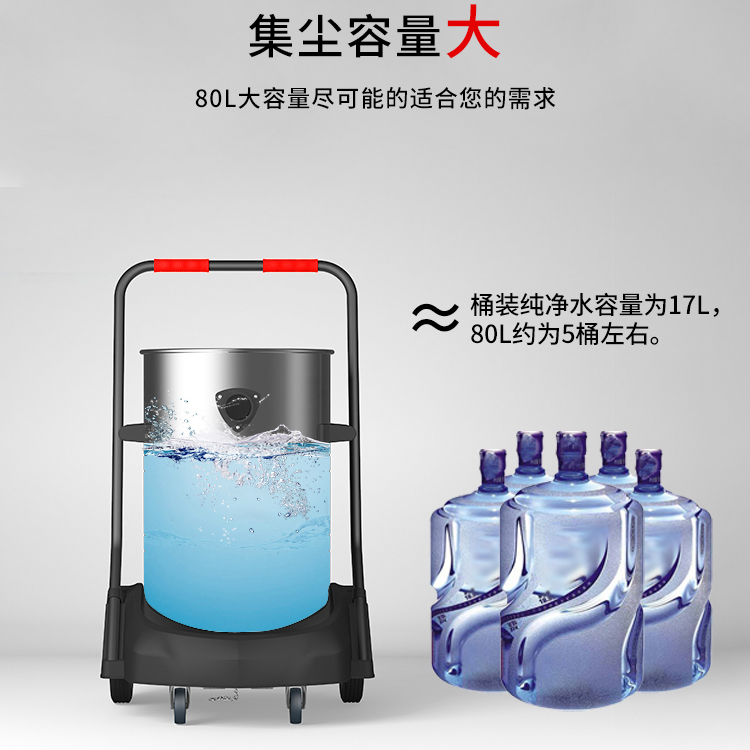 GS-2078S是一款工業(yè)型吸塵器,集塵桶為80L,為不銹鋼材質(zhì),配有車架,在移動(dòng)時(shí)輕巧方便,車架底座為PP材質(zhì),底座上有置物格,可放置配件或工具方便收納和使用;可以用在工廠、倉庫或建筑工地等場所清理灰塵等,在商業(yè)環(huán)境中也可以使用。