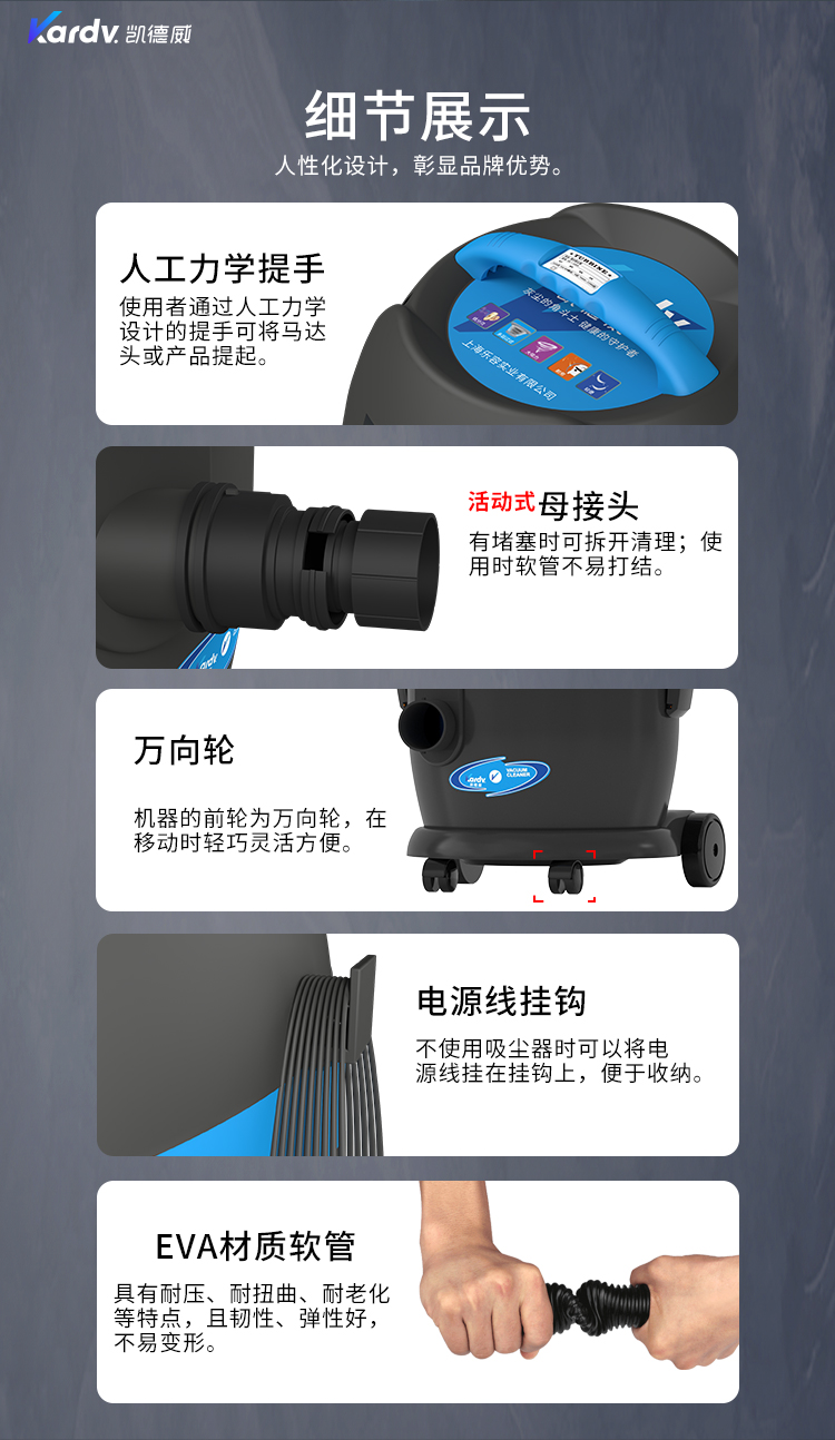 DL-1020是一款干濕兩用型吸塵器,集塵桶為20L;散熱上采用上下氣道分離設計;配有置物架,可以防止工具和配件,方便使用;可以用在倉庫、廠房等;也可與其它產品配套使用,也可用作將廢料收集;也可使用在普通的商業、企業環境,比如一般的辦公室、客房等。