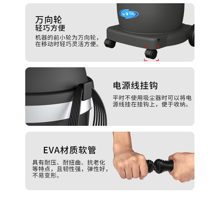DL-1232W是一款工商業(yè)用吸塵器,集塵桶為32L,配有置物架,可以放置工具和配件,方便使用;配有車架,方便機(jī)器移動;散熱上采用上下氣道分離設(shè)計,排風(fēng)上借鑒了汽車排氣管的消音原理,延長了排風(fēng)的路徑及時間,所以產(chǎn)生的聲音相對要比普通的吸塵器聲音小;多層過濾裝置,使排出來的空氣相對潔凈;可以用在工業(yè)實驗室、無塵車間、凈化車間環(huán)境中,也可以使用在普通的商業(yè)、企業(yè)的辦公環(huán)境。