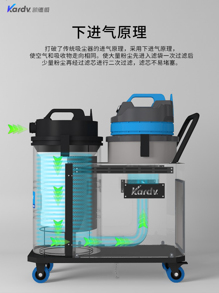 DL-3078X由我司設計,區別常規吸塵器的進氣方式,采用下進氣原理,在吸細小粉塵、紡織廠棉絮、棉絲等容易堵塞過濾器的垃圾時,使大部分垃圾直接進入布袋過濾,少量物質再經過濾器二次過濾,這樣解決了過濾器易堵塞的問題。